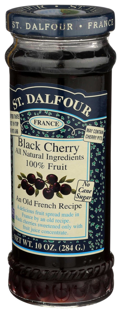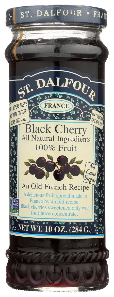St. dalfour black cherry fruit spread is made with non-gmo project verified ingredients and does not contain preservatives for a purer taste. we also avoid artificial colors and flavors. every 10 oz. jar is sweetened only with fruit juice concentrate, so you can savor the true flavors of the fruit. enjoy 14 servings per container.
