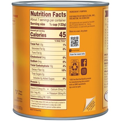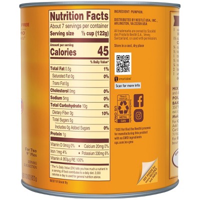 Libby's 100% Pure Canned Pumpkin lets you enjoy delicious pumpkin flavor in all your favorite recipes. Libby's all natural pumpkin puree offers a good source of fiber and contains no GMO ingredients* or preservatives. While it is used in our famous LIBBY'S Pumpkin Pie, you can also make delicious pancakes, smoothies, soups, pastas, pumpkin spice lattes, and more sweet and savory recipes. This pure pumpkin puree is easy to add to dessert mixes and batters. Each can contains 29 ounces of pumpkin puree for two 9-inch pumpkin pies. Using nutritious 100% pumpkin instead of eggs, oil and butter is a delicious way to feel good and enjoy the recipes you love. Store Libby's canned pumpkin puree in a cool, dry place. *SGS verified the Nestle process for manufacturing this product with no GMO ingredients sgs.com/no-gmo.