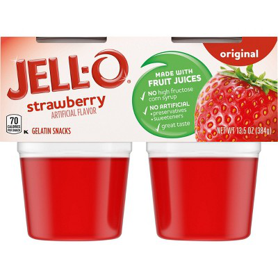 JELL-O Strawberry Gelatin Cups make for a delicious on the go snack. Each gelatin comes in individual snack cups, perfect for sneaking into a lunchbox or snacking at home. Our refreshing gelatin treats your taste buds to the juicy strawberry flavor you love, and the jiggly JELL-O cups make a scrumptious snack for kids and adults alike. The yummy, everyday treat is made with fruit juice and without high fructose corn syrup. It has 70 calories per serving and no artificial preservatives or sweeteners. Each 13.5-ounce sleeve contains four JELL-O Ready to Eat Strawberry Gelatin Cups for quick and easy snacking.