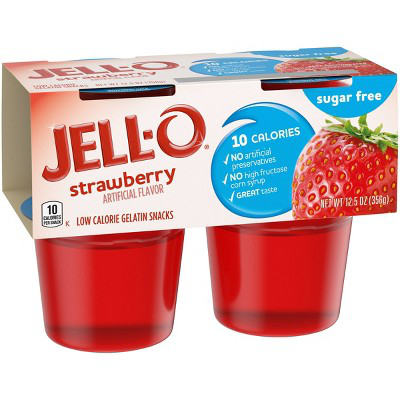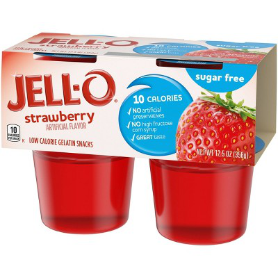 JELL-O Sugar Free Strawberry Gelatin Cups deliver the great taste of JELL-O Gelatin in a low-calorie choice. Our delicious on the go gelatin comes in individual snack cups, perfect for putting into a lunchbox or snacking at home. All jiggly JELL-O Cups make a scrumptious snack for kids and adults. The fruity strawberry gelatin is fat free and sugar free, with 10 calories per serving. Every strawberry gelatin cup is made without artificial preservatives or high fructose corn syrup and is great for those keeping Kosher. Each 12.5-ounce sleeve contains four JELL-O Strawberry Gelatin cups for quick and easy snacking.