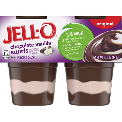 JELL-O Chocolate Vanilla Swirls Pudding cups are a delicious ready to eat, on the go pudding snack. Our sinfully smooth chocolate and vanilla pudding cups come in individual snack cups, perfect for packing in a lunchbox or snacking at home. Both kids and adults love our scrumptious snack. Jello pudding cups are made with milk and contain 110 calories per serving. Every swirl pudding cup is made without high fructose corn syrup and contain no artificial preservatives or sweeteners. Each 15.5-ounce sleeve contains four chocolate pudding cups for quick and easy snacking.