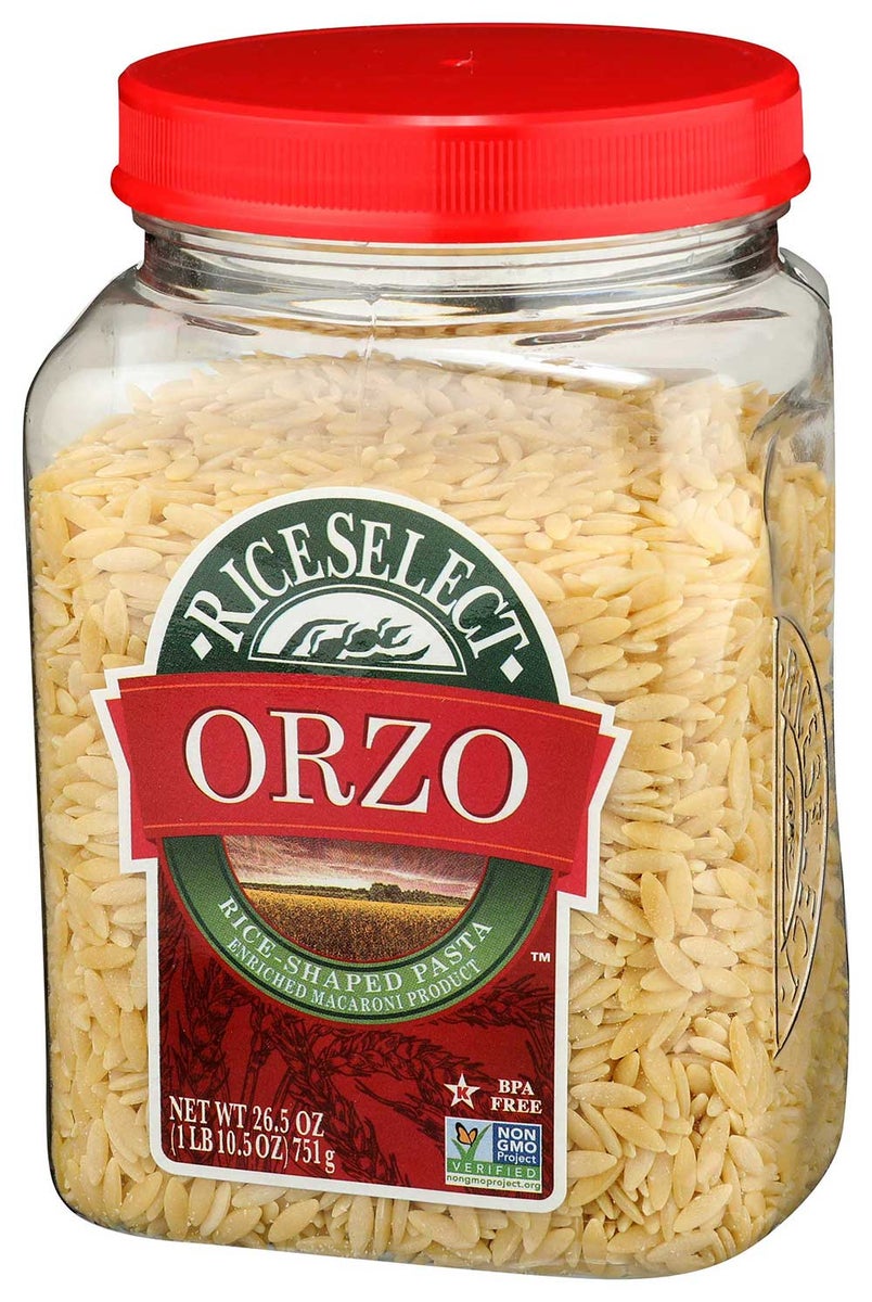 Bring your spontaneous brilliance to the kitchen and create an unforgettable meal with riceselect orzo! orzo is a little pasta that offers enormous culinary potential and made with 100% enriched durum semolina wheat - making it the perfect pantry staple for delicious and filling meals. resembling large grains of rice, this pasta is incredibly versatile and cooks in just 10 minutes. use it as normal pasta with sauce, in cold mediterranean salads, or warm soups like our lemon chicken and orzo soup. orzo is a great alternative to rice and is low in fat, cholesterol free, has no additives or preservatives, and is suitable for vegans and vegetarians. riceselect orzo is available in two other varieties: tri-color orzo and whole wheat orzo. for your convenience, our riceselect orzo is non-gmo project verified, certified kosher by star k, and packaged in a 26.5oz 100% recyclable, bpa-free jar.