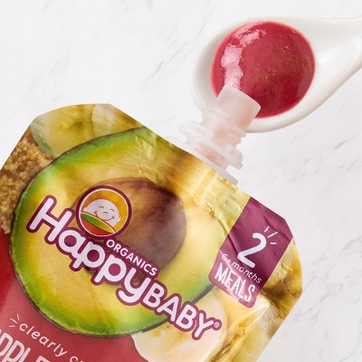 Happy baby purple carrots, bananas, avocados and quinoa baby food is clearly crafted and made with nutrition in mind. this baby food pouch is made with responsibly sourced, organic, kosher and non-gmo ingredients. one pouch can provide 2 meals to your 6+ month baby. clear packaging is used so you can see exactly what is feeding your childs nutrition. not only is this pouch full of natural flavor, but its also fat free. includes one 4 oz. pouch of baby food. at happy baby, we are dedicated to health and nutrition starting at day one. we know our farmers and see where our ingredients come from. we are the first baby food company to use clear packaging.