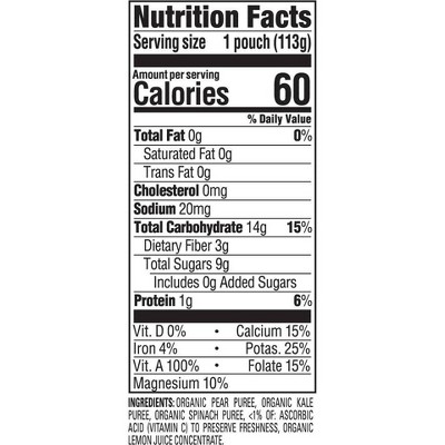 Happy baby clearly crafted stage 2, pears kale & spinach is an organic baby food blend with vitamins and fiber for children who are on the second stage of solid food. our enlightened nutrition philosophy makes every bite count with the right nutrition for a bright future. these purees are for babies 6+ months, are certified usda organic, non-gmo project verified and come in a 4 oz. pouch.