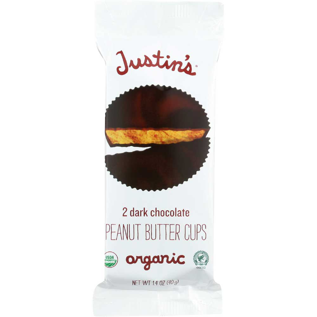 Justin's dark chocolate peanut butter cups are certified usda organic and made in small batches. we use naturally-delicious ingredients like organic peanuts, sustainably-sourced palm oil and rain forest alliance certified cocoa. our peanut butter cups come in a package of two and are certified gluten-free.