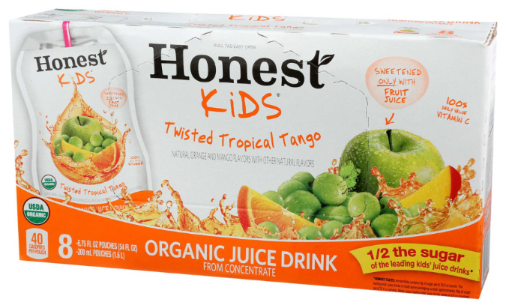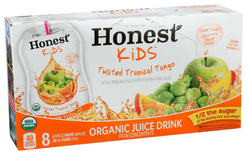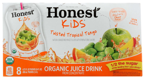 Honest kids tropical punch tropical juice is sweetened with only fruit juice which means that it has less sugar than the leading kids juice drinks. with only 9 g. of sugar per pouch, this is a drink you can feel good about giving to your kids. this delicious drink provides kids with 100% of their daily vitamin c and it is also organic, gluten-free and non-gmo. each box of honest kids tropical punch tropical juice contains eight 6.75 fl. oz. pouches.