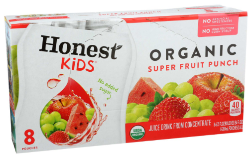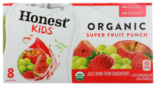 Honest kids juice drinks super fruit punch is an organic juice drink from concentrate and sweetened only with fruit juice. this product is in non gmo project verified which means that if there is a bioengineered version of an ingredient, they don't use it. the product comes in a pouch which makes it fun for kids and is easy for them to drink. each pouch contains approximately 20 g. of sugar per 6.75 fl. oz. serving. includes eight 6.75 fl. oz. pouches of punch.