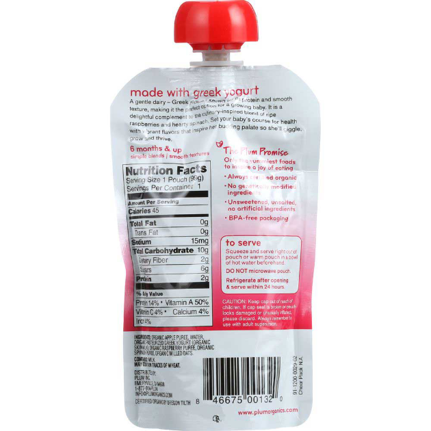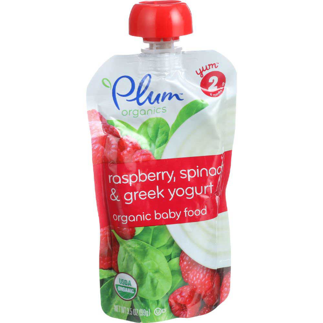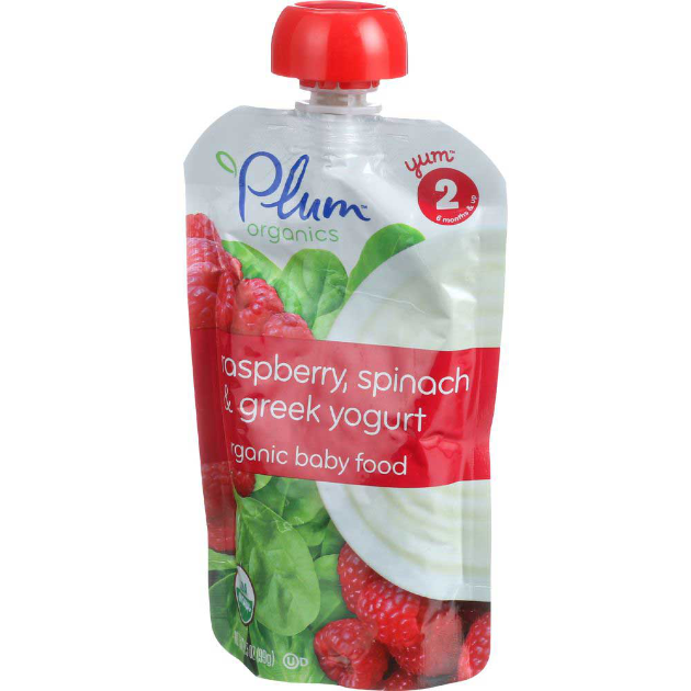 Plum organics raspberry, spinach and greek yogurt baby food is the perfect solution for nourishing your growing baby with the flavors they love and the nutrients they need. our baby food is made with no salt or sugar added and is non-gmo. additionally, our product is usda organic certified and kosher. included is one 3.5 oz. container of plum organics raspberry, spinach and greek yogurt baby food.