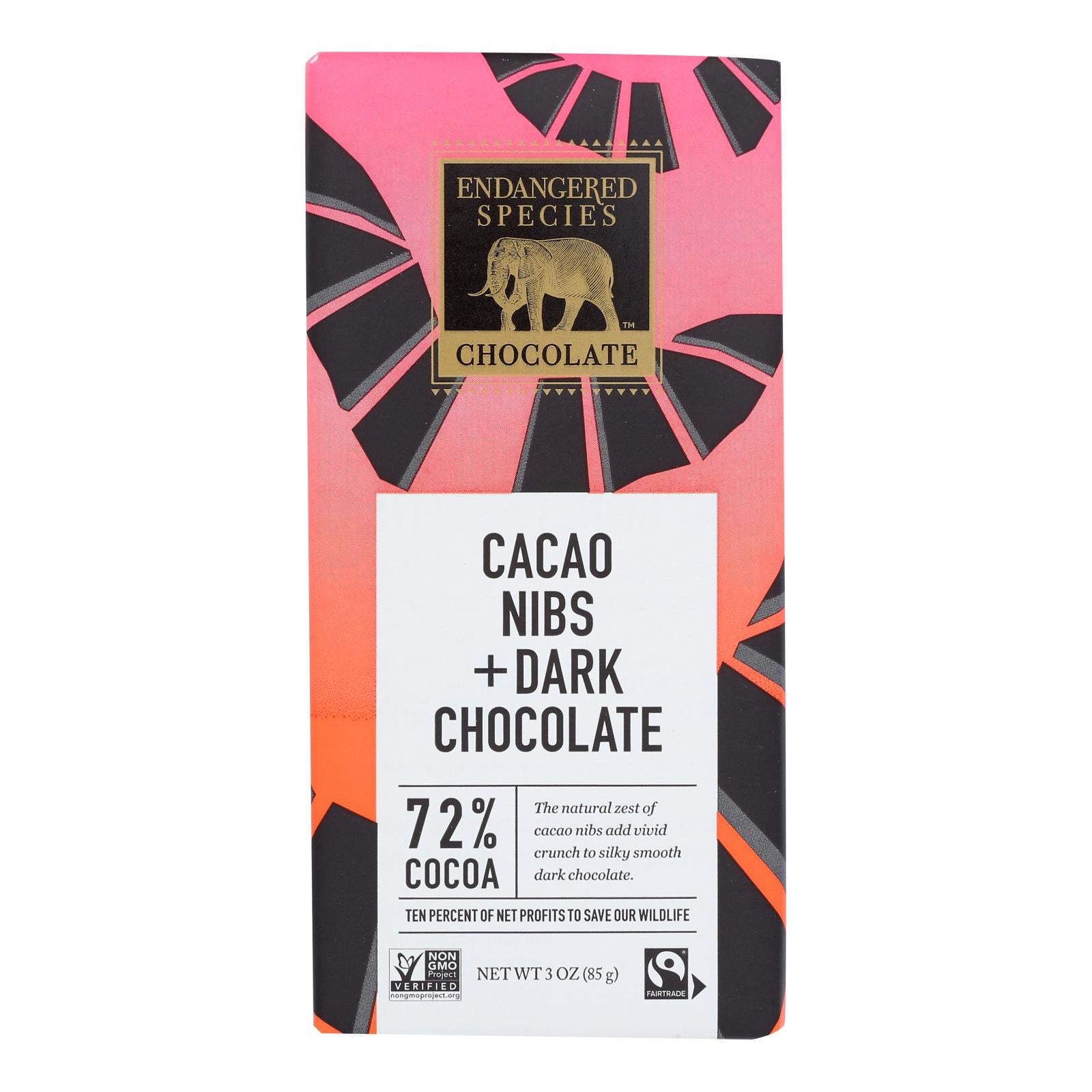 Endangered species chocolate bar, bat dark chocolate with cacao nibs is a delicious dark chocolate bar with the unique flavor combination of chocolate and cacao nibs. this chocolate bar is gluten-free, kosher and non-gmo, and contains information on the animal it is sponsoring. each bar contains 3 oz. of flavored chocolate. indulge in a cause. see nutrition facts panel for allergens.