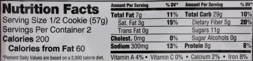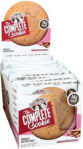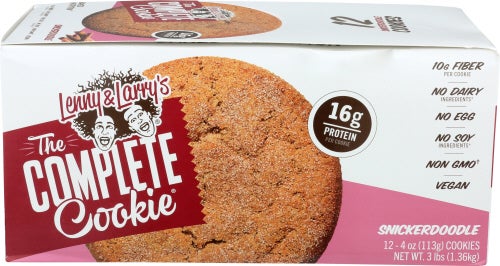 10 g fiber per cookie. 16 g protein per cookie. see nutrition information for sat. fat content. vegan. non gmo project verified. nongmoproject.org. plant-based. baked nutrition. a complete world of goodies. live the complete life with us lenny & larry's. the complete package: 16 g protein per cookie; 10 g fiber per cookie; non-gmo project verified; no soy ingredients (manufactured in a facility that also processes peanut, tree nut, soy, milk and egg); no dairy ingredients (manufactured in a facility that also processes peanut, tree nut, soy, milk and egg); no egg (manufactured in a facility that also processes peanut, tree nut, soy, milk and egg); vegan; kosher; no high fructose corn syrup; no artificial sweeteners; 0 g sugar alcohols; sustainable palm oil. lennylarry.com. instagram. facebook. lennyandlarrys. baked in usa.
