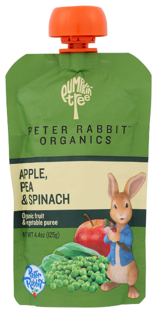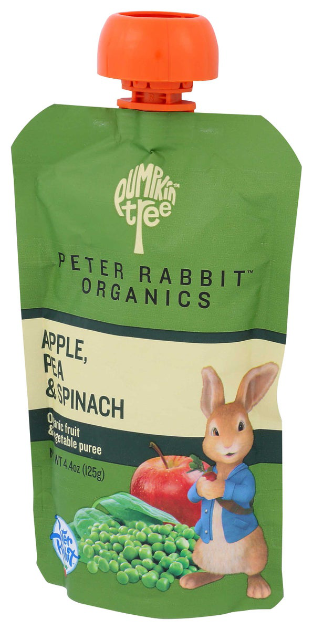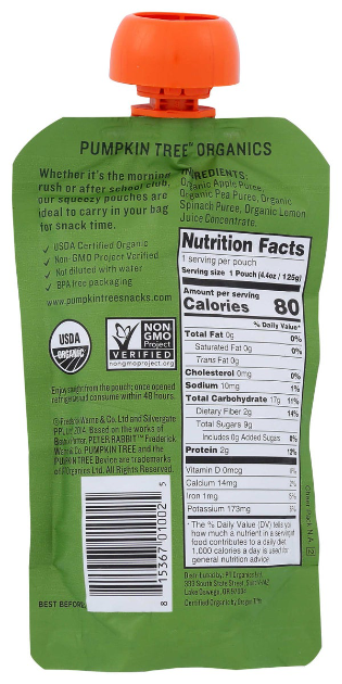 Pumpkin tree organics pea, spinach and apple snack is usda organic certified and made from pure fruits and vegetables. every 4.4 oz. pouch of pumpkin tree pea, spinach and apple is made without added salt, sugar or water. a 1-pouch serving provides 3 g. of fiber, 2 g. of protein and 35% of the daily recommended value of vitamin c.
